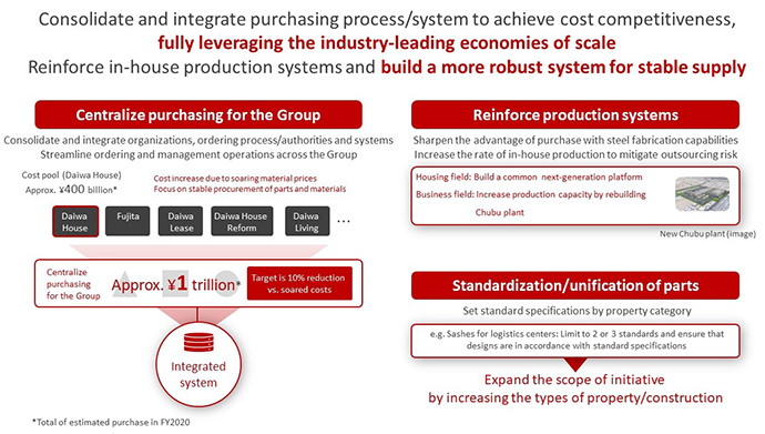 We will promote group centralized purchasing, which allows us to take full advantage of the economies of scale of being number one in the construction industry, and aim to curb costs by 10% after the cost increase. Furthermore, in order to ensure a stable supply of materials, the Company will reduce the risk of outsourcing by leveraging its strength in having its own steel frame fabrication capabilities and enhancing its production system.